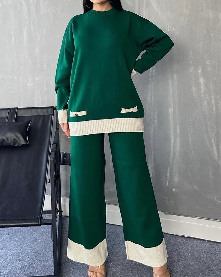 Introducing Premium Knit Co Ord - a luxurious two piece set featuring a stylish jumper with contrast borders and intricate gold button detailing. Complete the look with the matching wide leg trousers, designed with an elasticated waist for ultimate comfort. Perfect for elevating your winter outings with elegance and sophistication.