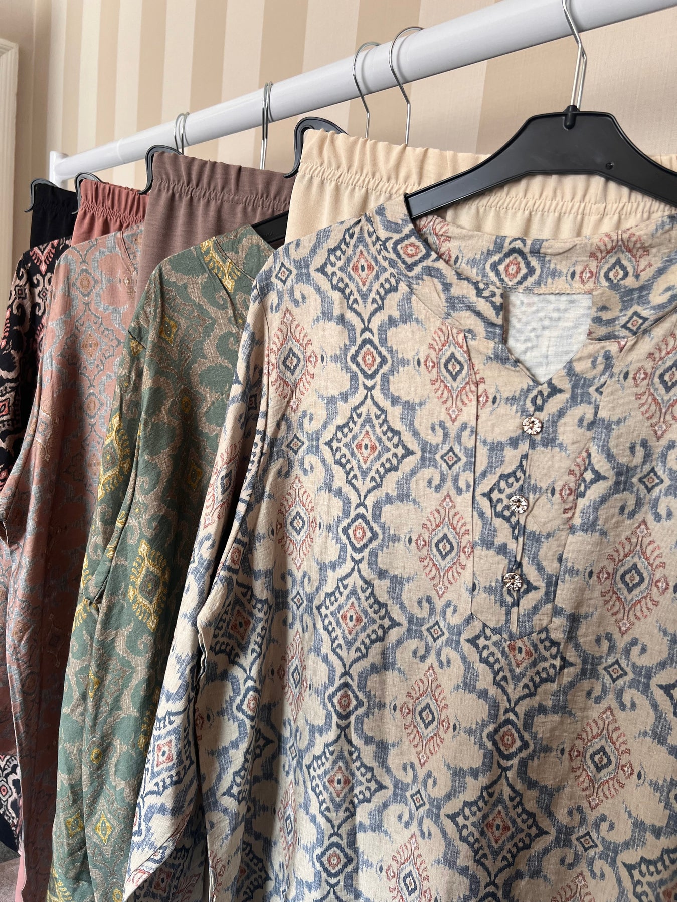 Effortlessly stylish and versatile, the Saima Print Co Ord is a must-have addition to your wardrobe. The printed top is adorned with button details, while the matching wide leg trousers provide a comfortable and chic look. Elevate your style with this coordinated set!