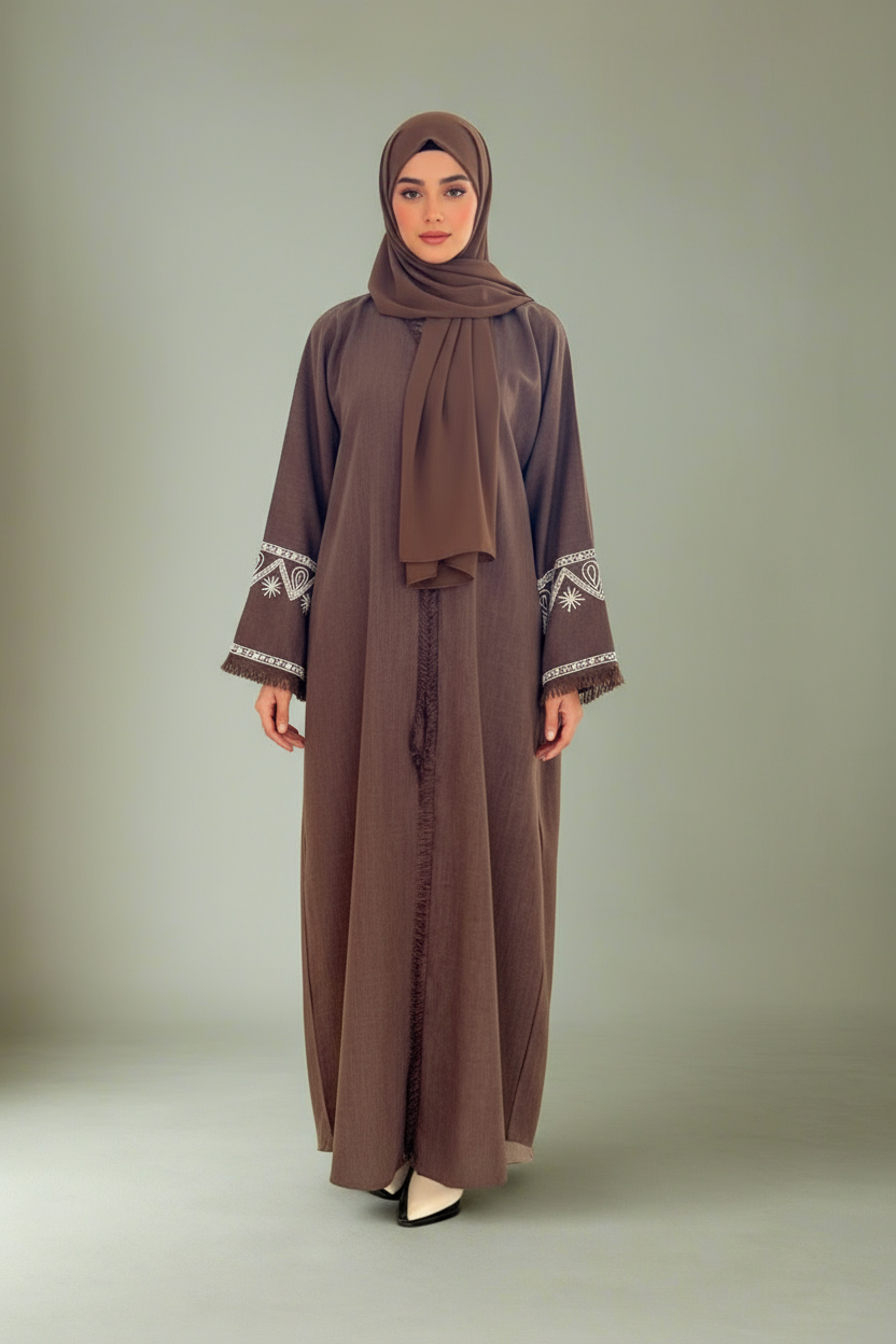 Experience luxury with our Embellished Satin Kaftan Gown. This stunning kaftan is adorned with crystals and features loose sleeve with crystal detailing. The inner belt can be tied for a more fitted look or left open for an oversized silhouette. Perfect for formal occasions or special events, elevate your style with this exclusive kaftan. Comes with a matching Shayla/Scarf Hijab. Available in sizes 52(S), 54(M), 56(L), and 58(XL). Length is measured in inches and increases with size, providing a longer, more elegant fit. Size measure longer than average due to tie belt option
