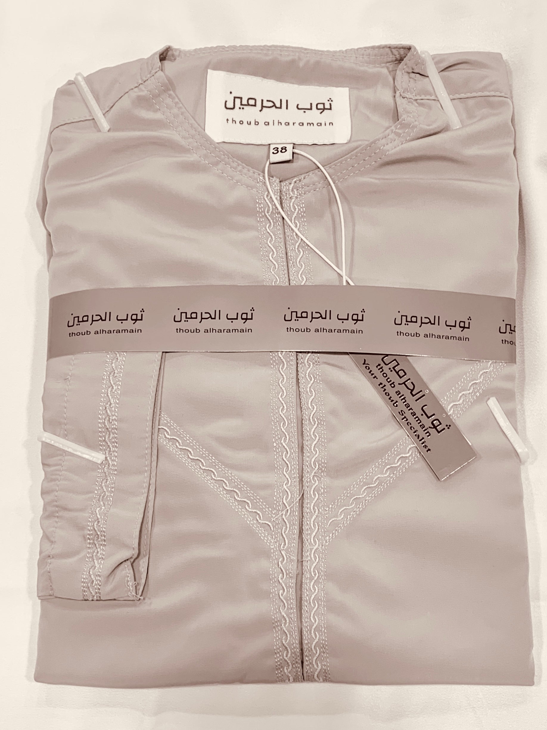 A Medium weight comfortable collarless thobe with side hidden pockets and subtle rounded V embroidered with threaded Tassel