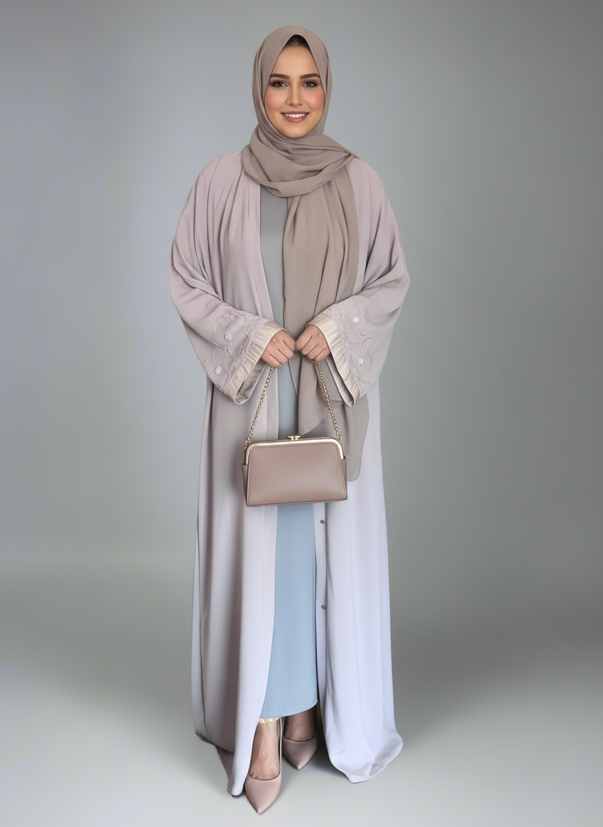 "The Nida Abaya features intricately beaded floral designs on the sleeves and elegant organza trim. With a convenient front button closure and a coordinating scarf, this abaya offers effortless style and practicality."