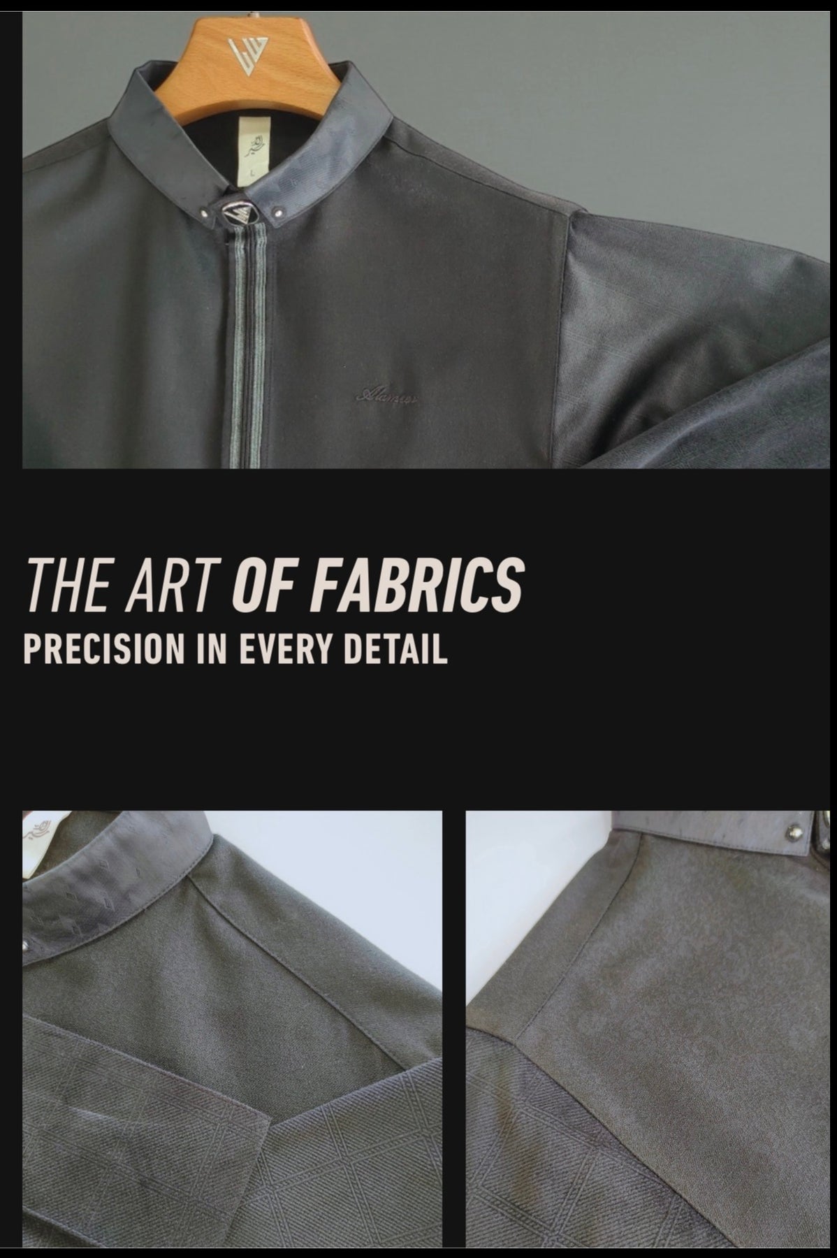 Made from a premium textured fabric in a deep black tone, this thobe delivers a smooth, structured drape while remaining lightweight and breathable. The snug stand collar is finished with subtle texture detailing and polished metal accents, offering a sharp, tailored look.