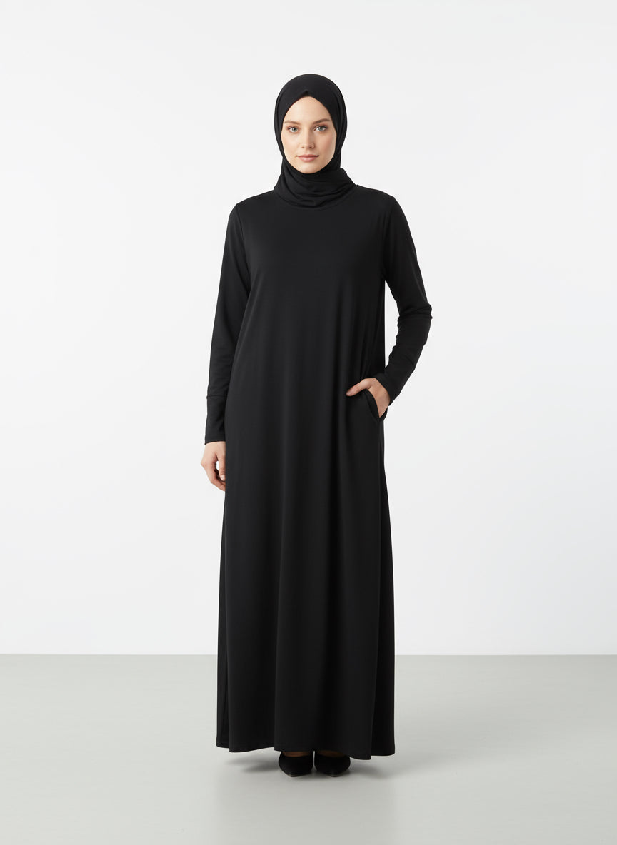 Made from a thick and durable fabric that is perfect for colder weather, this Black Winter Plain Jersey Abaya features a round neck and a hidden pocket on one side. The machine washable fabric is easy to care for, making it ideal for everyday wear. Available in sizes 52-58, this abaya is crafted from a heavy weight, non-creasing jersey material that is sure to keep you warm and comfortable during the autumn and winter seasons. Please note that the sleeves may vary from the picture shown.
